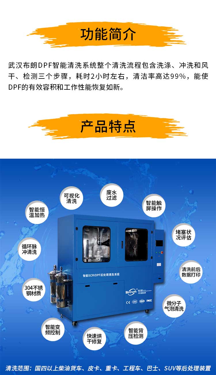 武汉布朗DPF清洗设备是一款智能多用途、操作简便的柴油车后处理清洗设备,适用国四、国五、国六客、货、重卡车辆的后处理系统(SCR三元催化器、DPF颗粒捕捉器)清洗设备;配套专用接头将各部件的积碳、颗粒及尿素结晶体进行全面清洗,使DPF各部件还原到良好壮态,从而达到提升动力、降低尾汽的目的。