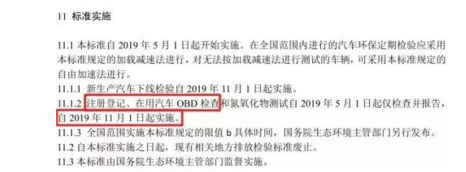 第二步,对于标准新增内容,如柴油车NOx检测和OBD检查,2019年11月1日起正式实施。根据大气污染防治法的有关规定,具备条件的地区可经省级人民政府批准并经向生态环境部备案后,可早于上述日期提前实施在用车排放标准。